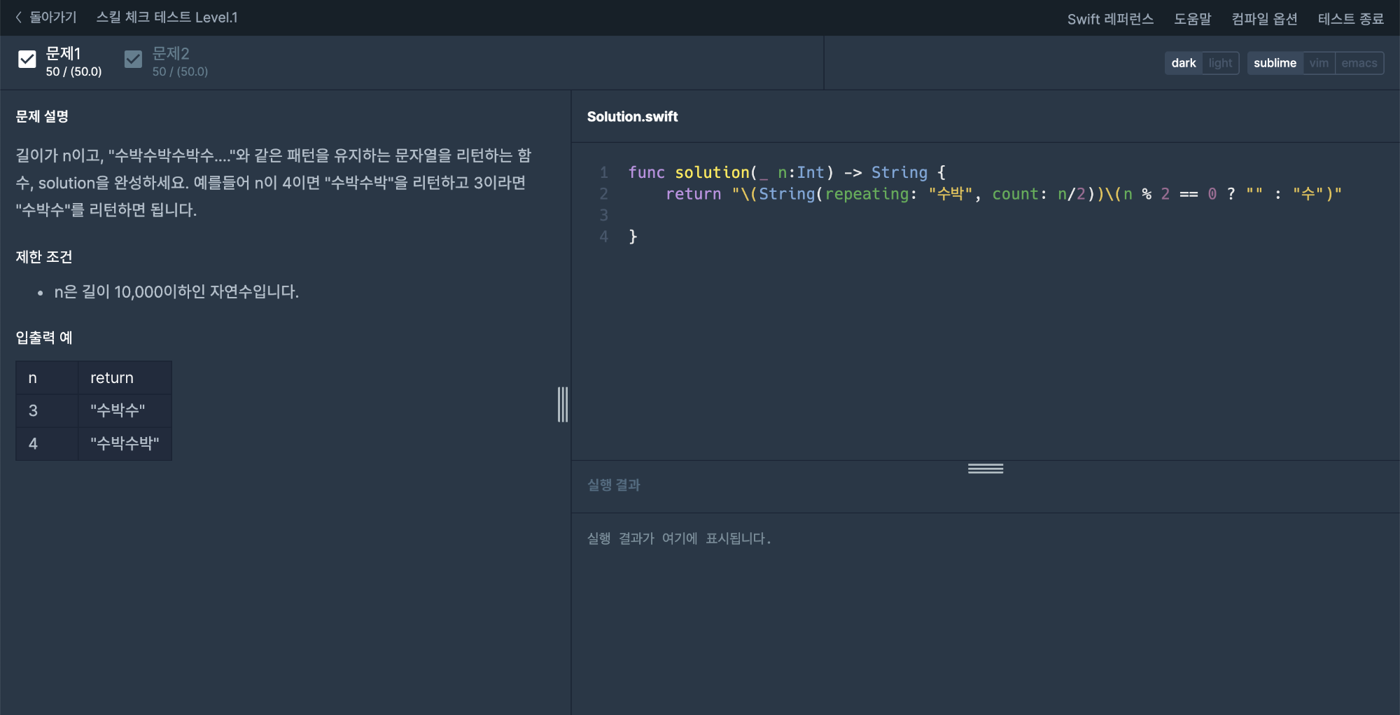 - 길이가 n이고, :수박수박수박수...."와 같은 패턴을 유지하는 문자열을 리턴하는 함수, solution을 완성하세요. 예를들어 n이 4이면 "수박수박"을 리턴하고 3이라면 "수박수"를 리턴하면 됩니다.
