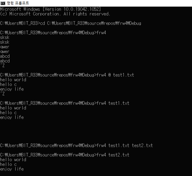 frw4 test1.txt test2.txt | 일반 파일 | 일반 파일 | 일반파일의 내용을 일반파일로 출력 |